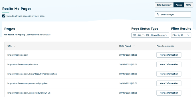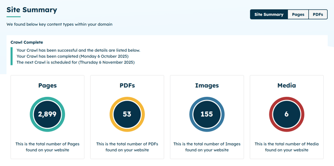 The Crawler identifies web pages and key assets such as PDFs, media, and images across your site, giving you a more complete view of your content. You also have the option to automatically include all detected pages in your next scan, ensuring comprehensive coverage whenever you choose.