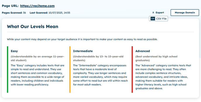 Our content analyser, powered using the Flesch-Kincaid reading grade system, now lets you download a CSV report of your scanned pages, each with its own unique readability rating. Use these insights to spot trends and make informed improvements to ensure your content remains clear, consistent, and accessible to your target audience.