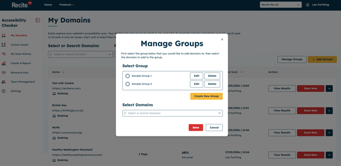 Within My Domains, Admin users will now see a new “Manage Groups” option. This allows them to create groups and associate specific domains to each group for easier organisation.