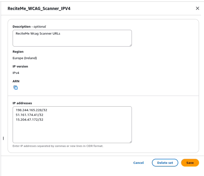 - Head to the WAF & Shield section, you can find the link in the left column and create a new IP Set in WAF and add those IPs.