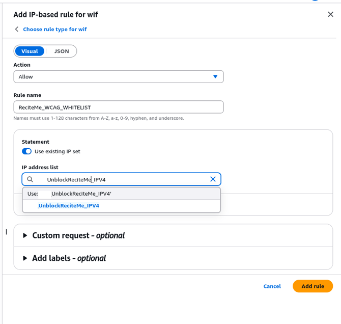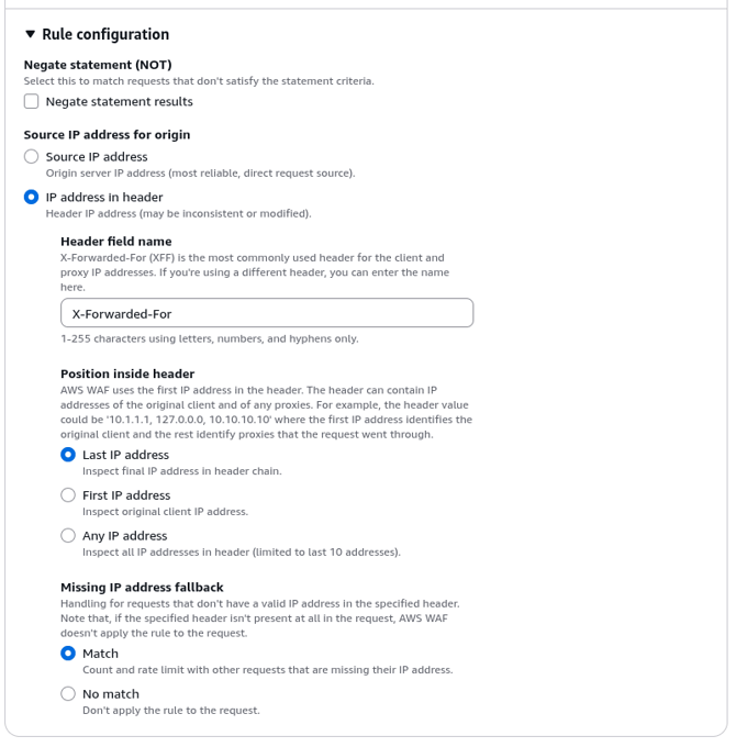 - The rule configuration should look like (toggle either ‘IP address in header’ or ‘Source IP’):